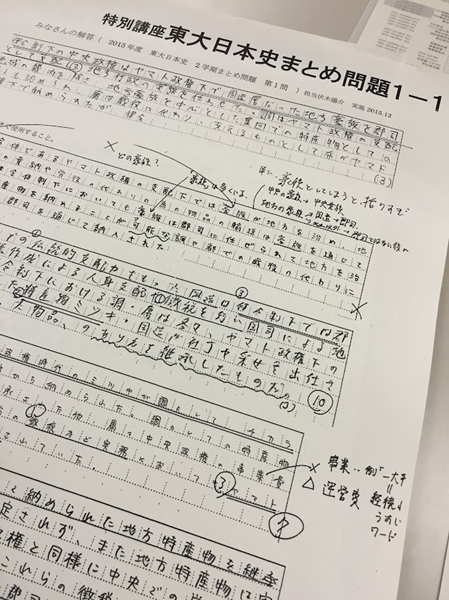 東大の入試問題(日本史)の多くは、初見の史料や図表が提示されます。これに解答する生徒たちは、自分の知識を単に書き連ねるのではなく、「なぜこの資料が提示されているのか」「この資料と既習の事案はどう結びつくのか」をその場でさまざまな仮説を提示、考察し、資料に即して(論としての説得性も持たせながら)、限られた字数でアウトプットすることが求められます。これは、学問としての歴史学をはじめとする研究に見られる(史料)批判と解釈のプロセスそのものであり、発展的な学びを構築するための最良の基礎となります。