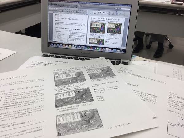 例えば一例として、写真にも掲載している「そのデータはなぜそうなんだろう」を紹介します。この授業は、有名な歴史シミュレーションゲームの画面を使いながら、歴史人物になぜそのようなステータス(能力値)が付与されているのかを探ります。実在の歴史人物を活用したゲームでは、たいてい歴史事実からその数値を類推して措定しています。この原因をそれぞれの人物史の中から、それこそゲーム感覚で探っていく。地理の授業では、例えば地域の生鮮食品売り場の陳列物を写真に納め、この生鮮食品売り場のレパートリーの特徴から、その販路や地域的特徴を仮説を立てながら探っていく…、など、いろいろな切り口を考えるのは楽しいものです。数学の授業で「和算」「算額」 などに注目し、歴史✕数学での授業を実施したこともありました。