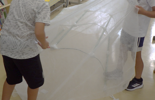 ビニールハウスづくりに向けて、Bさんたちは近くの店で材料を買い求め、教室に持ち込んで実際に作り始めていました。